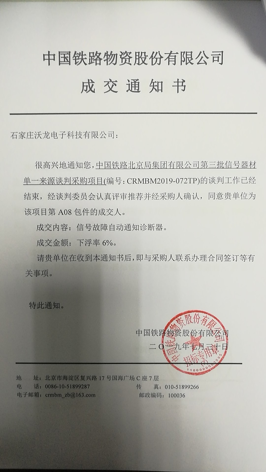 日成功中標中國鐵路北京局集團有限公司第三批信號器材單一來源談判采購項目。