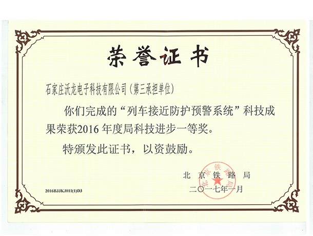 我司“列車接近防護(hù)預(yù)警系統(tǒng)”榮獲中國鐵路北京局集團(tuán)有限公司2016年度科技進(jìn)步一等獎(jiǎng)。